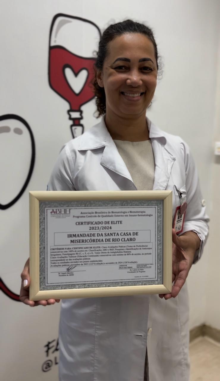 Equipe nota 10! O Banco de Sangue da Santa Casa de Rio Claro recebeu o certificado Elite 2024, concedido pela Associação Brasileira de Hematologia e Hemoterapia (ABHH). 💉 A certificação é emitida pelo Programa de Controle de Qualidade Externo em Imuno-Hematologia e este reconhecimento é baseado em 100% de acertos, em cinco avaliações práticas (testes de proficiência). Parabéns a toda equipe! 🩸❤️